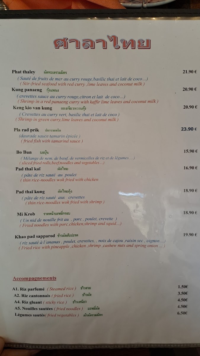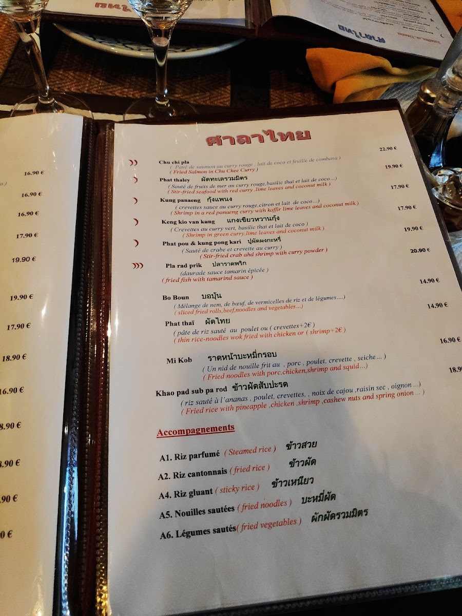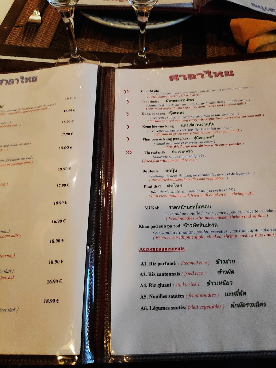 Other notable options include the Poulet Thai Et Dorade Royale Grillée, a grilled chicken and royal bream dish that balances smoky flavors with Thai spices, and the Crevettes Curry, which offers prawns in a fragrant curry sauce. For those who enjoy a good noodle dish, the Nouilles Sautées Et Curry provides a delicious mix of stir-fried noodles and curry, while the Porc Au Basilic is another variation on the popular basil pork dish, this time with a slightly different twist.