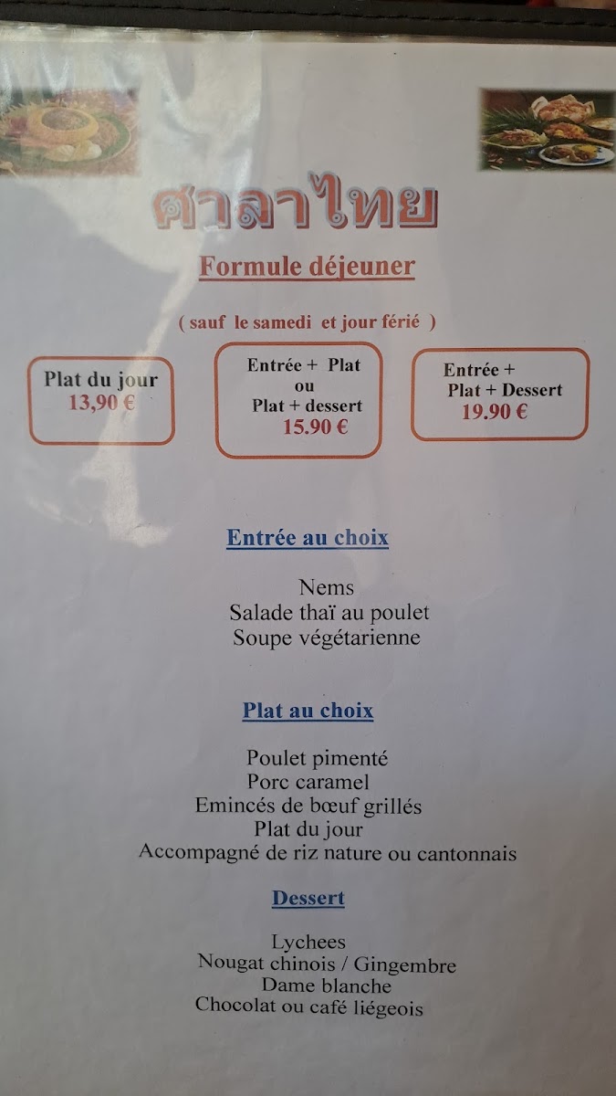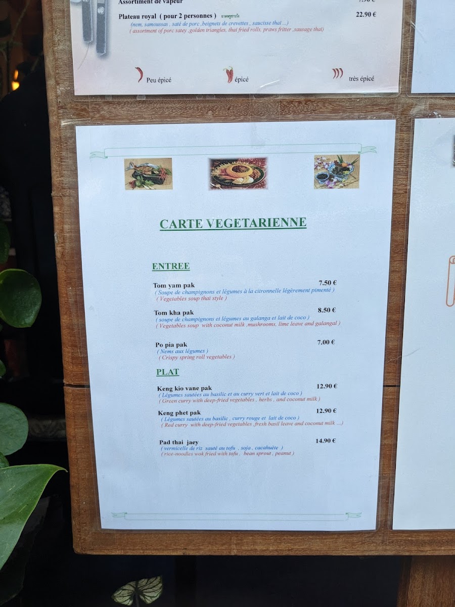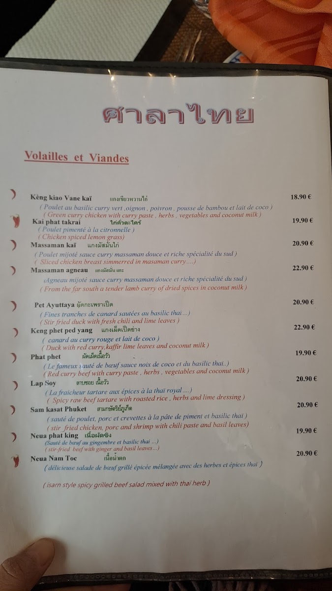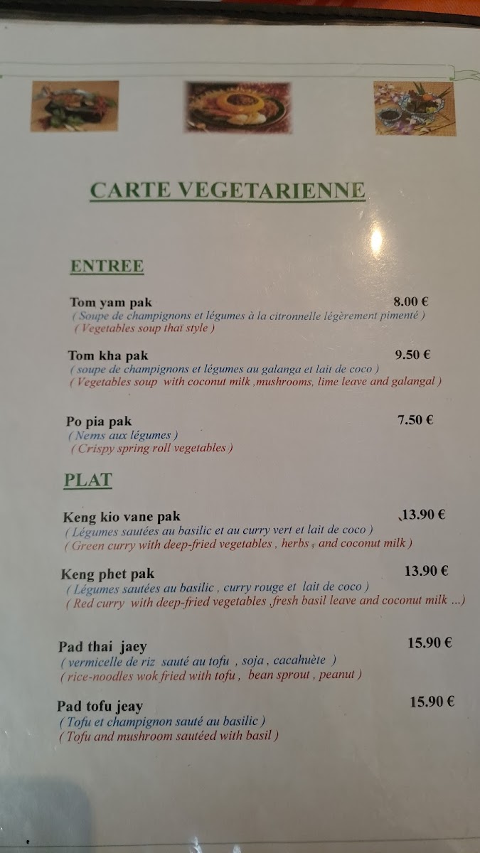 Other notable options include the Poulet Thai Et Dorade Royale Grillée, a grilled chicken and royal bream dish that balances smoky flavors with Thai spices, and the Crevettes Curry, which offers prawns in a fragrant curry sauce. For those who enjoy a good noodle dish, the Nouilles Sautées Et Curry provides a delicious mix of stir-fried noodles and curry, while the Porc Au Basilic is another variation on the popular basil pork dish, this time with a slightly different twist.